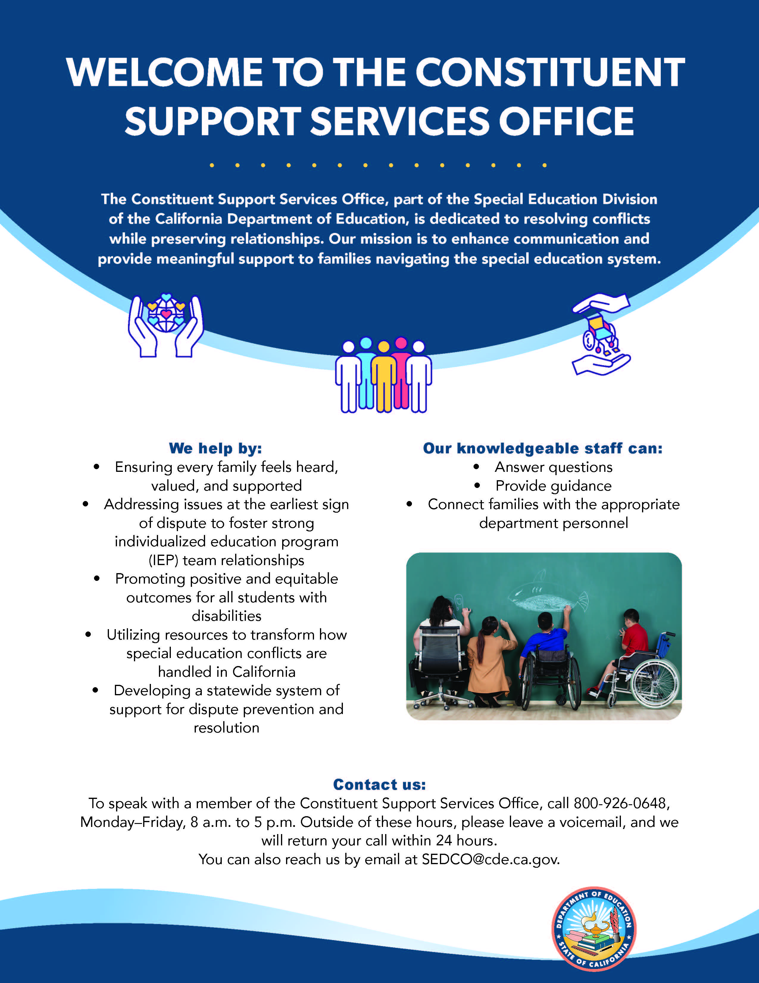 The Constituent Support Services Office, part of the Special Education Division of the California Department of Education, is dedicated to resolving conflicts while preserving relationships. Our mission is to enhance communication and provide meaningful support to families navigating the special education system.