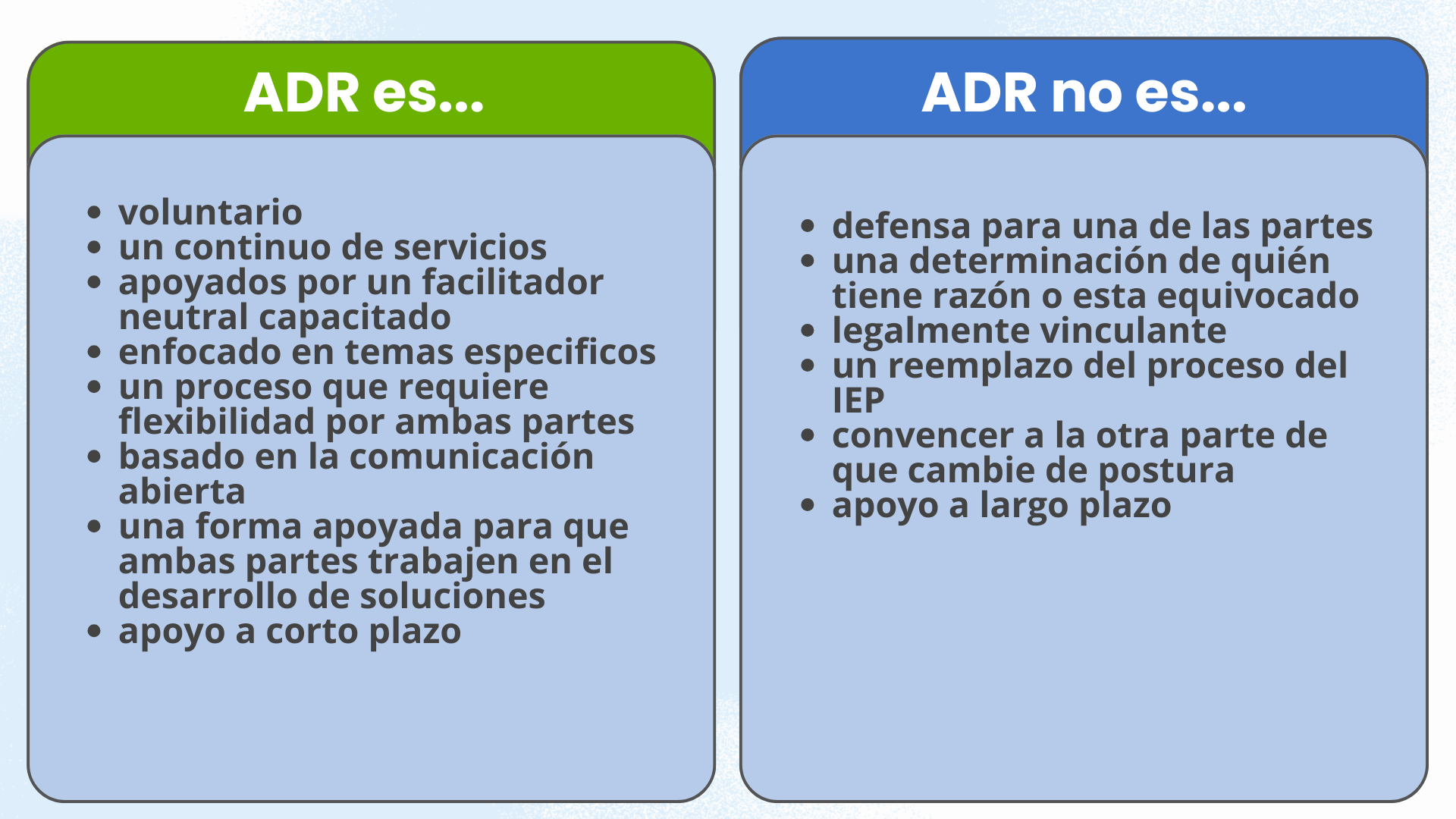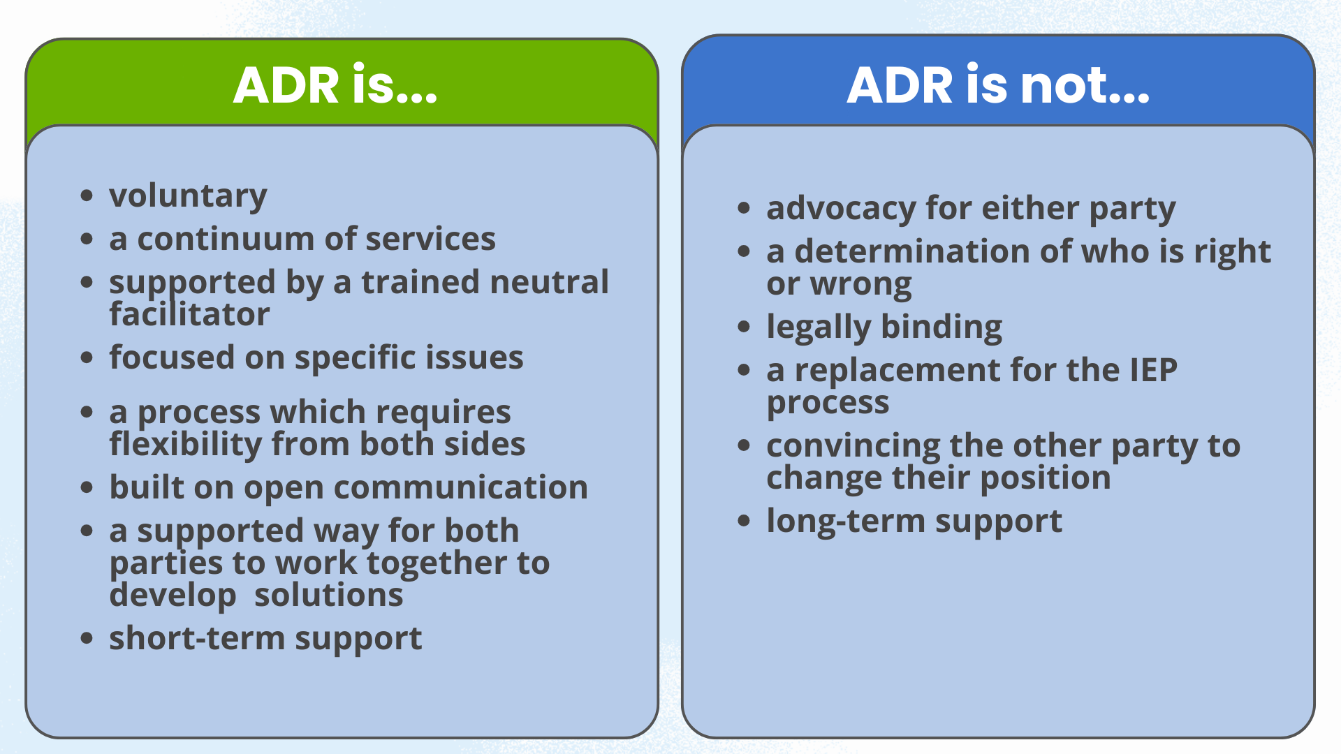On ocassion, members of the IEP team may not be able to come to agreement as to what is best for your child, even after trying to come to agreement throught the ADR process. Special education law provides specific steps for resolving those conflicts. If you continue to disagree, you may file for Due Process. Due Process is a system in which people from the State Department of Education step in to assist with resolving the conflict. Please visit the Office of Administrative Hearings website for access to the Due Process Guide or to download the Mediation or Due Process forms.
